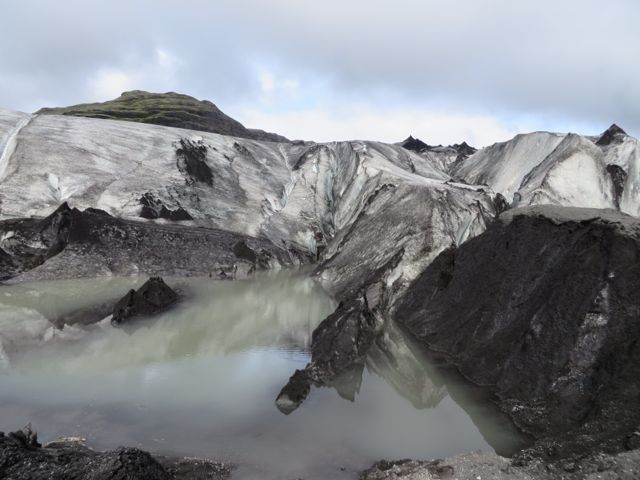 But this is one sickly dragon. Year by year, Sólheimajökull disappears, further into the mountain. My visit to Sólheimajökull in June 2013 was my first visit to such a massive glacier. Everything from the rugged cliffs and blue-tinted caverns of ice to the elaborate patterns braided in fine silt at the edges of glacial ponds left me in awe.