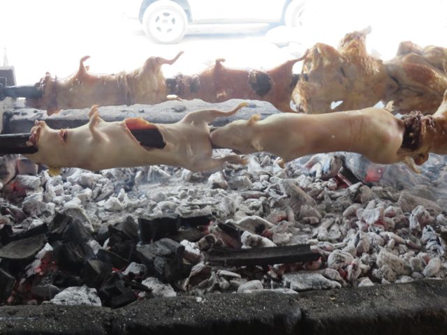 Guinea pigs (or cuy) are part of the comida tipica (traditional food) of Ecuador and Peru, and they are typically roasted on a spit alongside pigs and chickens.