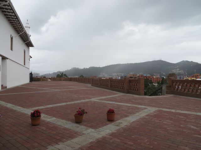 The terrace of Todo Santos, with Puro Cafe at the other end, and the mountains of Cajas National Park off in the distance (obscured by clouds).