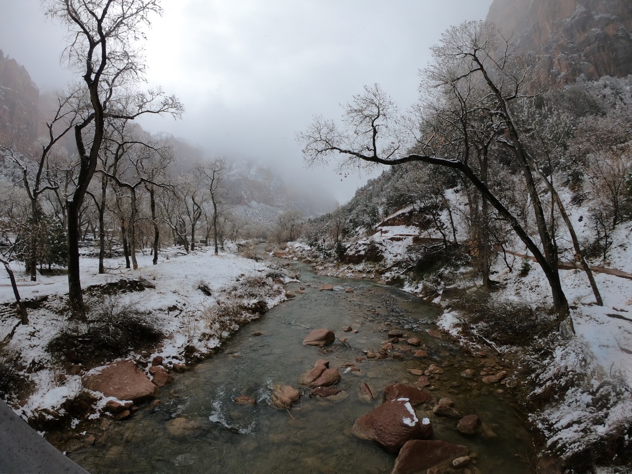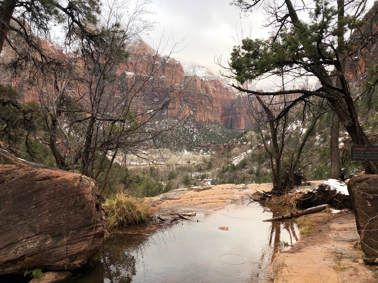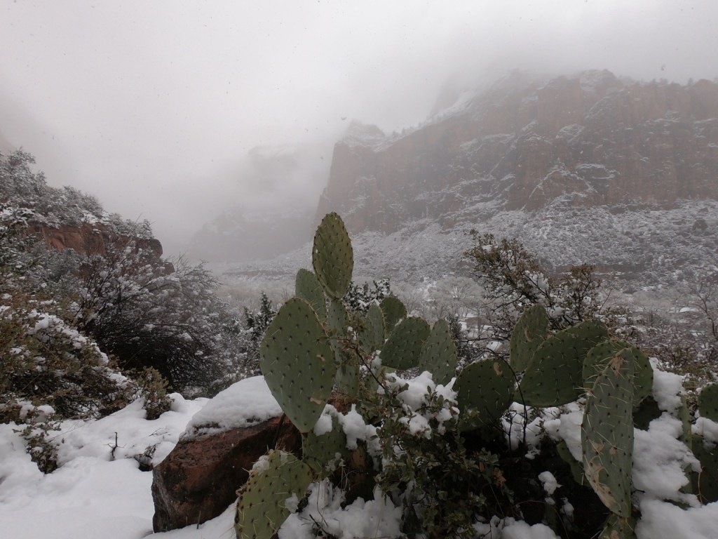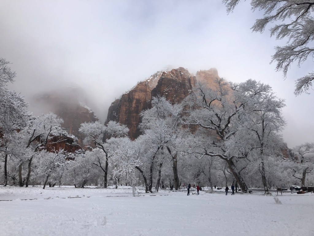 I love that my first memories of Zion National Park will always be shrouded in an icy haze. Arriving in a new place after dark – whether it’s a rainforest, a bustling South American city, or a natural cathedral carved through the desert over millions of years – always leaves me disoriented. And then it snowed through the night, covering roads and painting still-bare trees in white. The world felt pillow-soft as I stepped out of my cabin. I walked across the grounds of the lodge, and the fog shifted to give me my first glimpse of a canyon wall. I had no idea how far these walls rose up, but I could feel the ones I couldn’t see – in the stillness, and in that sense of being enclosed and protected.