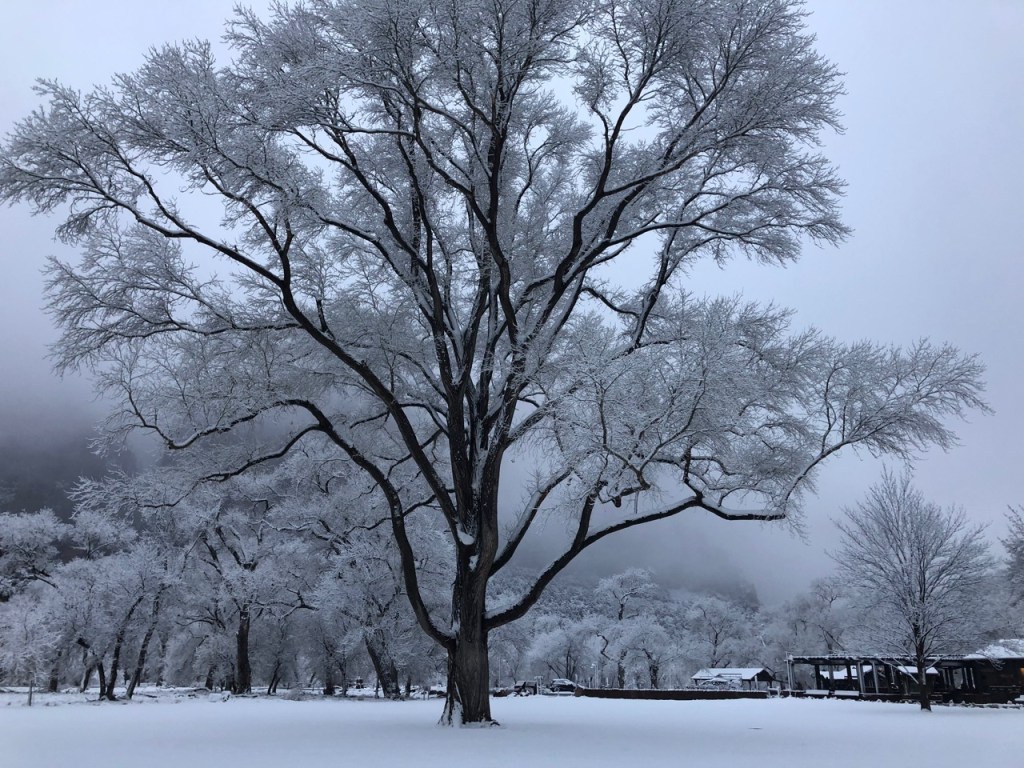 It was just before 8am and people were beginning to stir. A group of three young women emerged from another cabin gasping in surprise as they reach for their phones. I walked past the main lodge to the trail that runs along the road. I crossed under some low-hanging snow-weighted branches to access the trail and felt like I had passed a veil into a magic kingdom. Red canyon walls starting to emerge from the mist reminded me of citadels on some alien planet in a sci-fi novel.