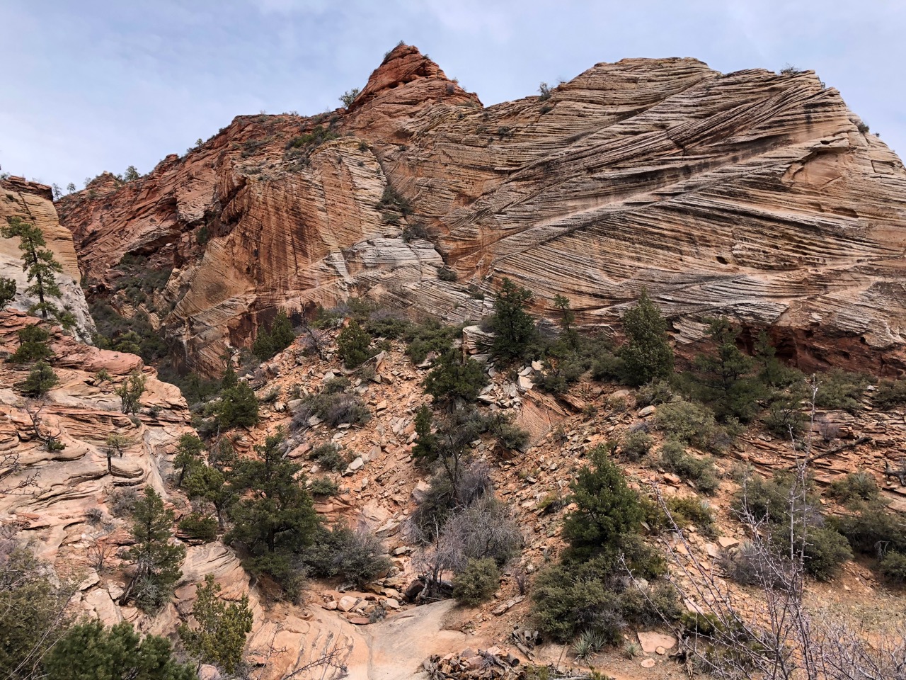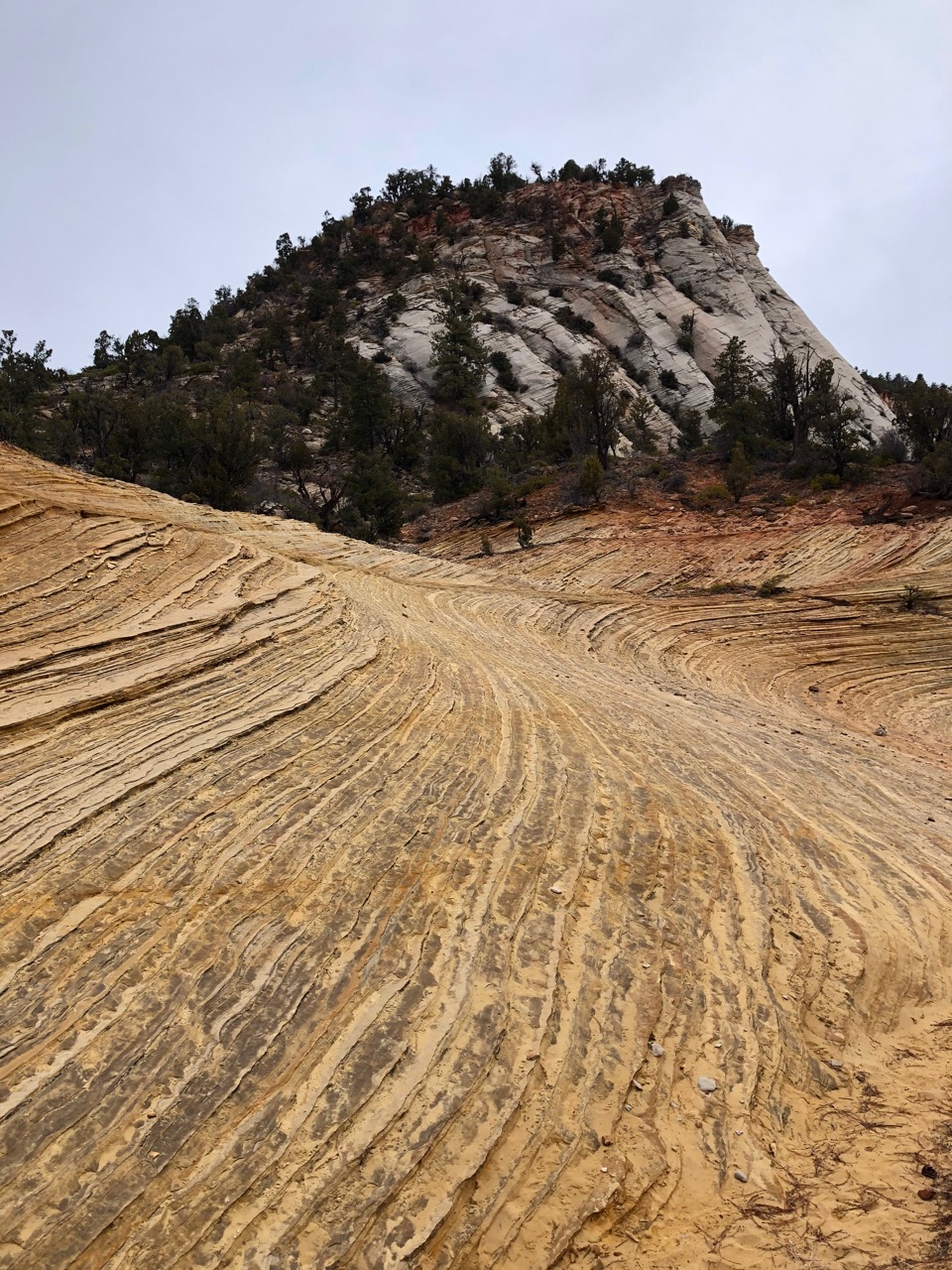 I tried to hold this in mind as I walked across these layers. It’s not hard to imagine what it used to be – a vast sea of sand dunes. Despite the snow, and the fact that it’s mid-March, the canyon is buzzing with people after 9am. We forego the infamous Angel’s Landing hike across a ridge with 1000 foot drop-offs and hordes of unmasked people so that we can hike in peace in a less dramatic part of the park, but one that lets me feel deep time beneath my feet. The direction of the angled layers of rock criss-crossing the landscape suggest that the prevailing wind 250 million or so years ago was from the north. But that’s our north, today. I know that North America was tilted about 90 degrees to the right 250 million years ago, straddling the Equator. So I imagine these winds could have been northeast trades, traversing thousands of miles of dry, hot earth in the Permian, when all of the continents formed one large landmass that stretched 20 thousand kilometers from the South to the North Pole.