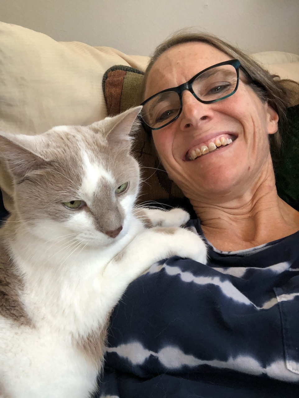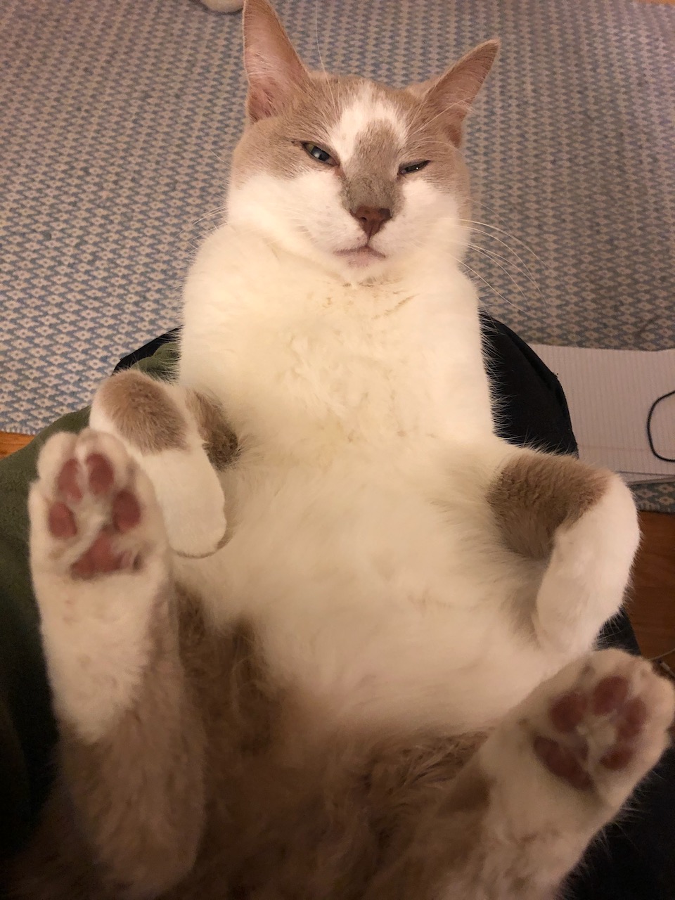 I think that he took it upon himself to be my source of comfort in difficult times. Not long after I adopted him, I went through a divorce, and he would stand on my pillow, near my face, and sniff my tears. When my Mom died, I spent a night sobbing on the living room couch. Mochi came along and lay stretched out flat on my belly, his little head beneath my chin and his his legs wrapped around me in a giant hug. In that first week of the pandemic, when fear and uncertainty ran rampant, the world shut down, and there wasn’t enough toilet paper, he slept next to my pillow, occasionally inching his head up to my shoulder. A little 9.5-pound ball of furry comfort. On election night in November 2020, in the stress and uncertainty, I began screaming in my sleep. I awoke to what felt like a hand on my shoulder, but opened my eyes to find him staring into my face, his front two feet pressing against my shoulder. As soon as I awoke, he began nuzzling my face with his little kitty kisses.