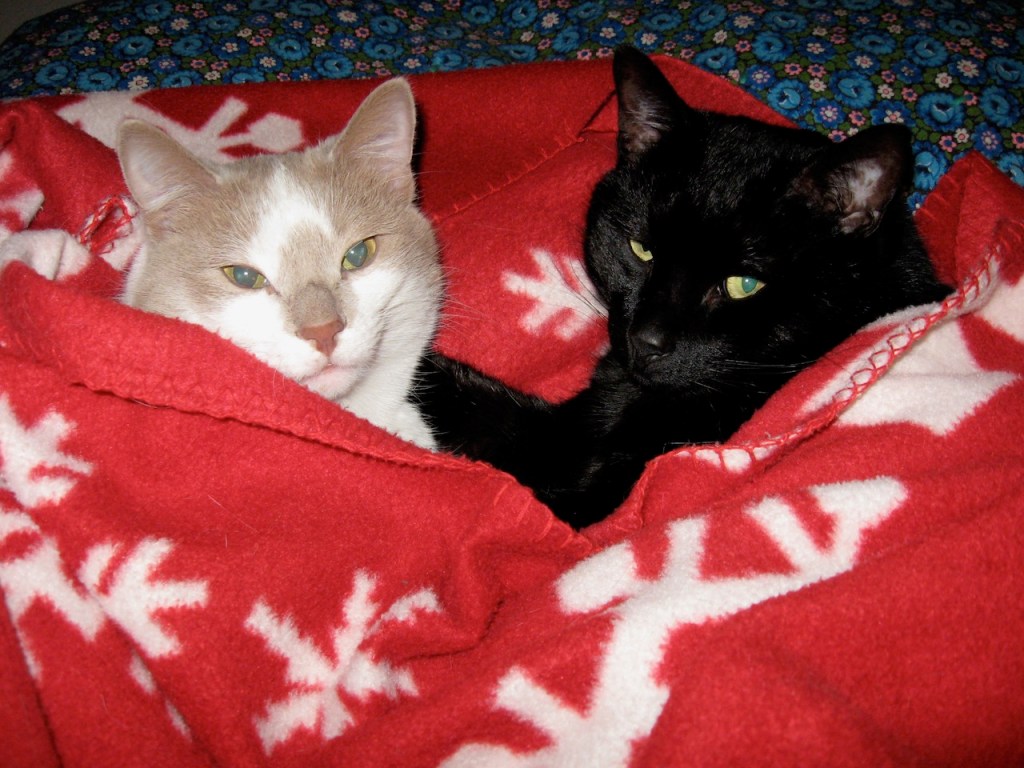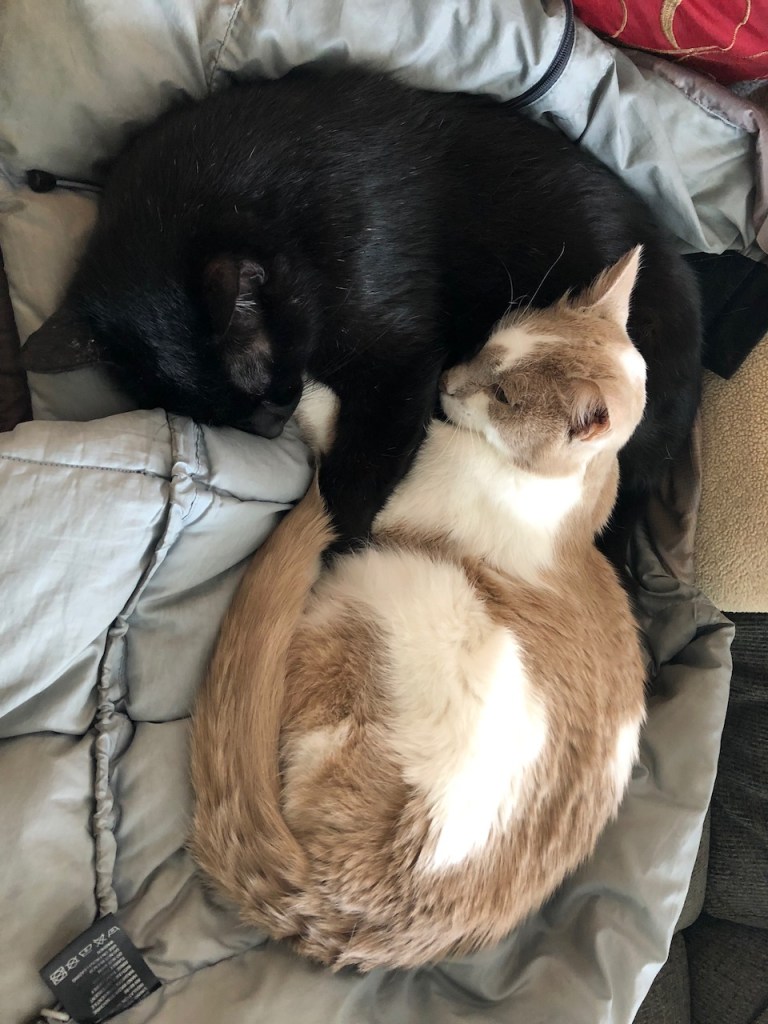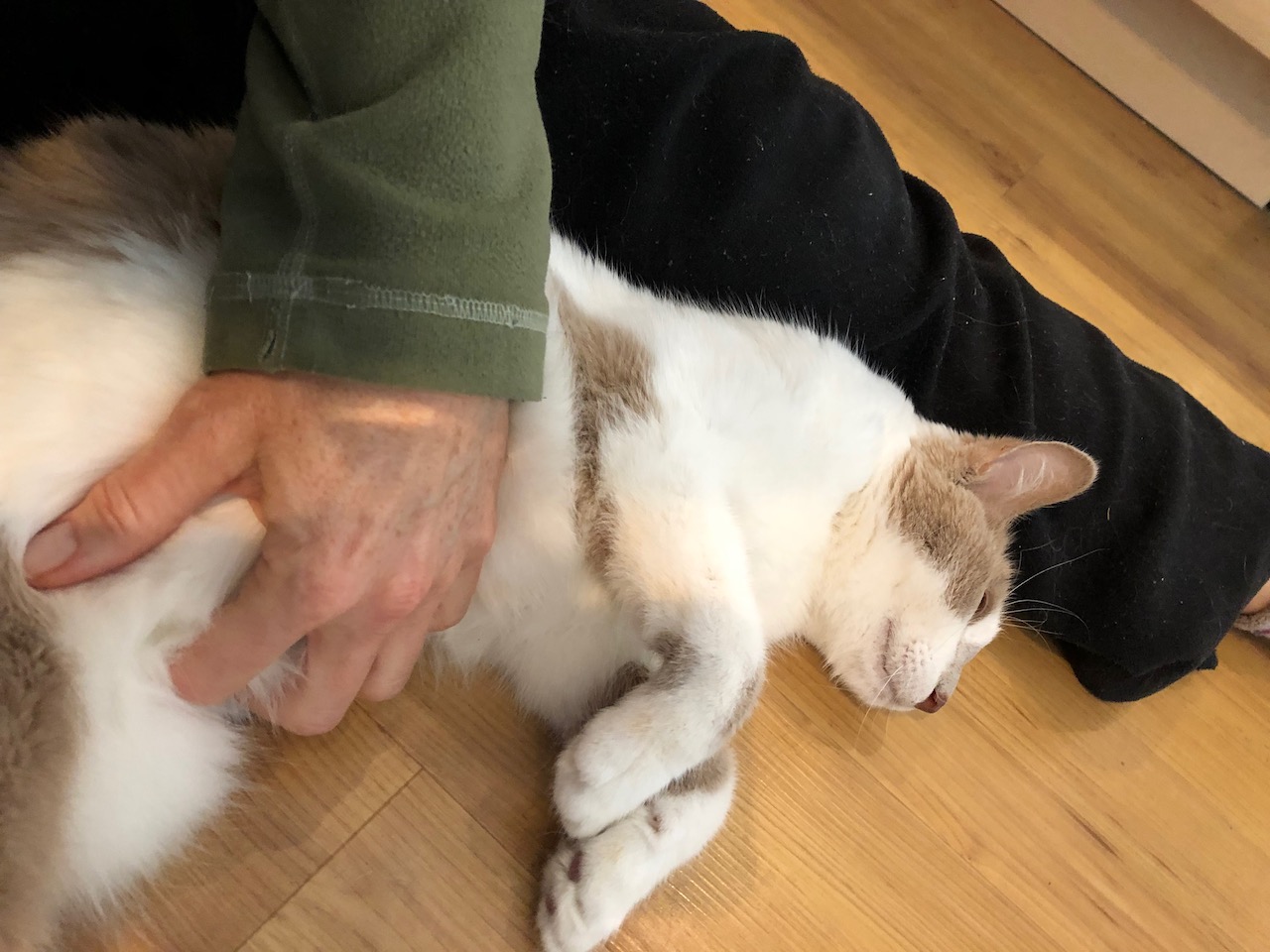 We held a two-day vigil over him at the end of his life, showering him with attention, and any treats he cared to eat. Though, there weren’t many. I think eating was painful for him, with that egg-sized mass that had grown in his belly. There were moments when I wondered: are we doing the right thing, sending him on his way before he got much sicker? He’d perk up for a bit, and I’d think: Maybe he has a few more good days? We lay in the sun for a long time, both of us on our sides, as I rubbed his belly. He purred. And Guinness cuddled up with us too. A big circle of love. Guinness would wash and lick Mochi until his white fur was gleaming.