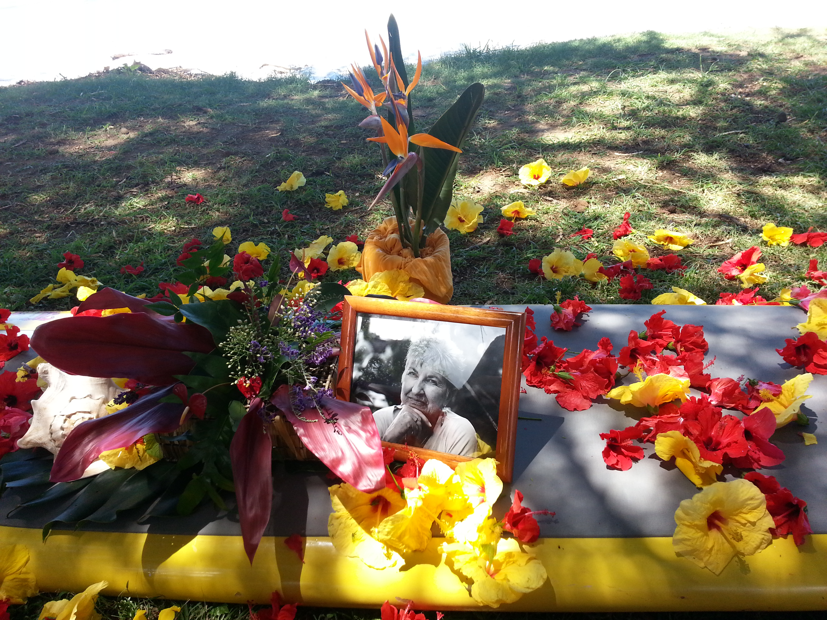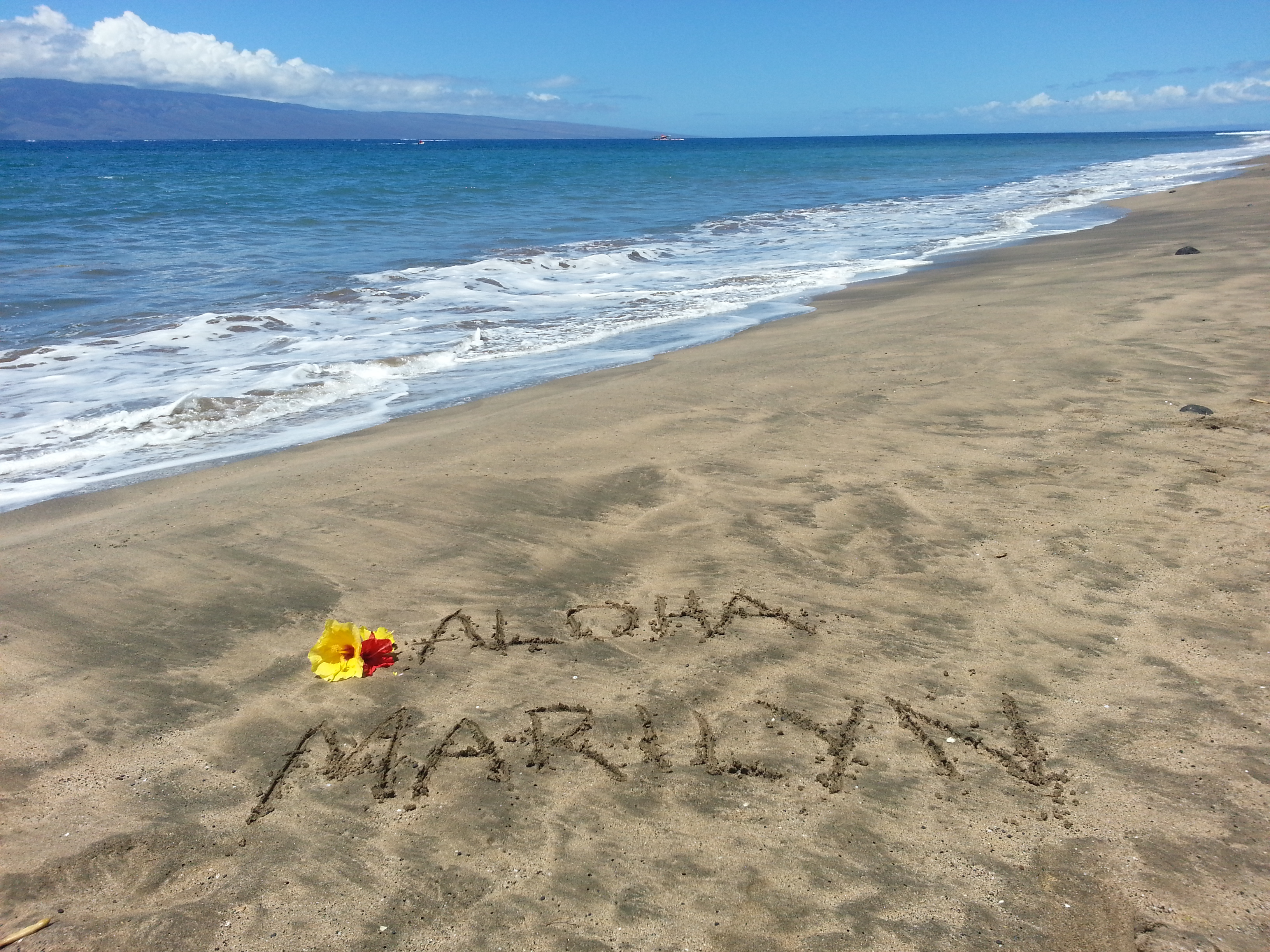 On this 2014 visit, my brother, Dad and I floated out onto the ocean on surfboards, along with a Hawaiian spirit-man named Kaleo. At least, he felt like a spirit-man to us, because, in giving us space to grieve, he gave us a connection with spirit. Mom was there too. We were surrounded by red and yellow hibiscus, bobbing in the waves, and Kaleo held a small bag with her ashes. He tipped the bag and poured the ashes into the sea. For once, I didn’t feel like crying. I watched the fine sands form a white cloud in the water. The cloud grew larger, then turned shades of light blue as she became part of the ocean. From somewhere, I heard a deep sigh, such relief, such ease. She was home again.