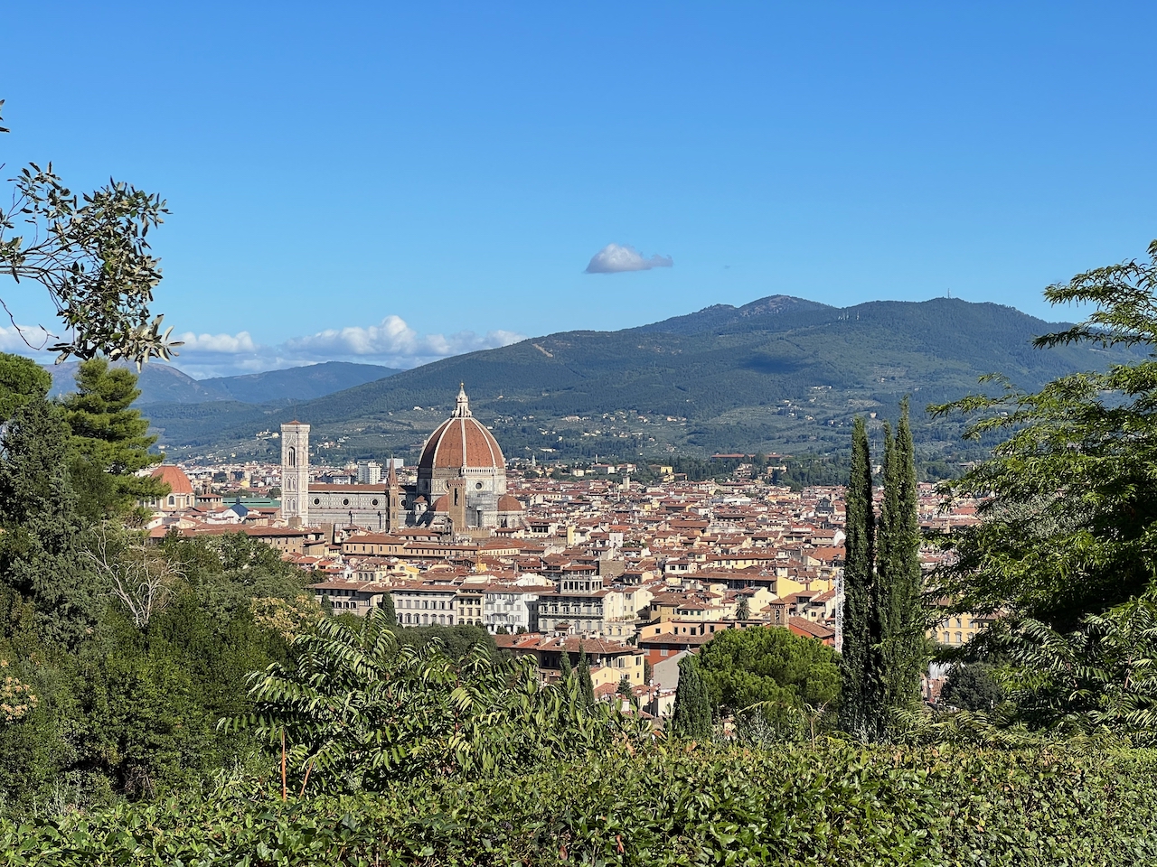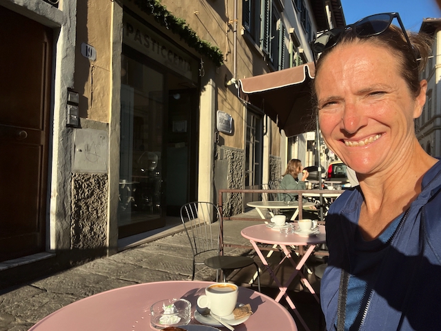 Finally, I will remember walking into the neighborhood pasticceria, Boun Amici, on my fourth morning in Florence. The barista took one look at me and asked, “Cappuccino d’soia?” Soy cappuccino. I had been ordering that every morning along with a chocolate croissant from the tiny but busy pasticceria. I would eat them outside at the little pink tables lining the street behind a small barrier (clearly a pandemic installation). I’d sit at the little table as the sun moved out from behind the buildings down the street to shine right in my face. I was hoping that would help reset my circadian rhythm, and move the hands of my body clock to align with the sun’s position in the sky.