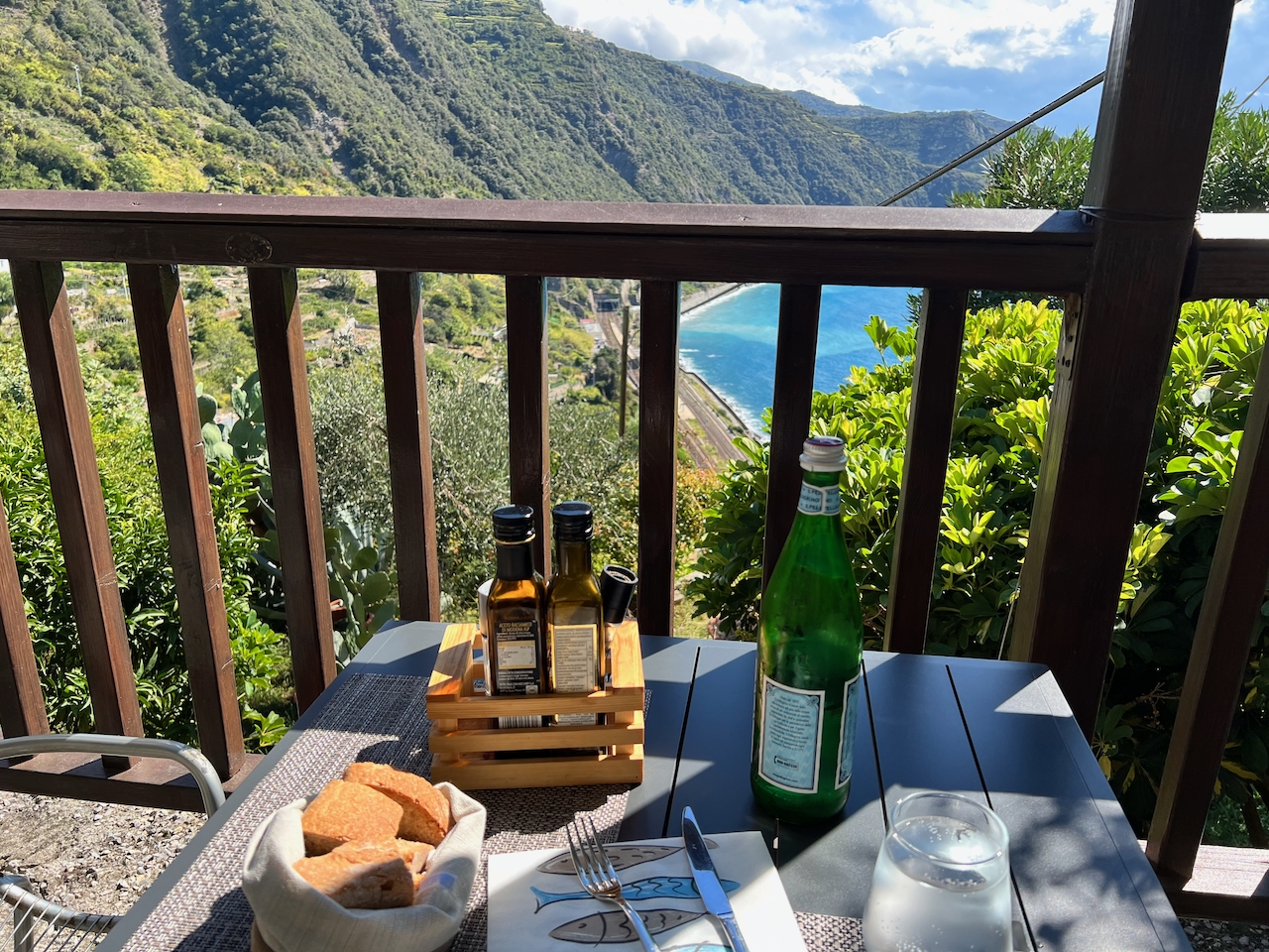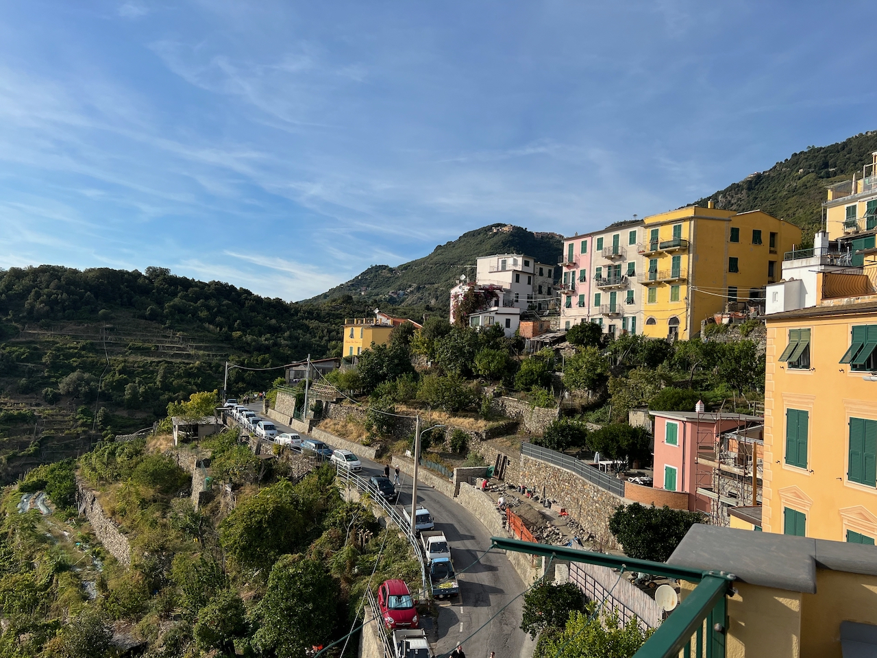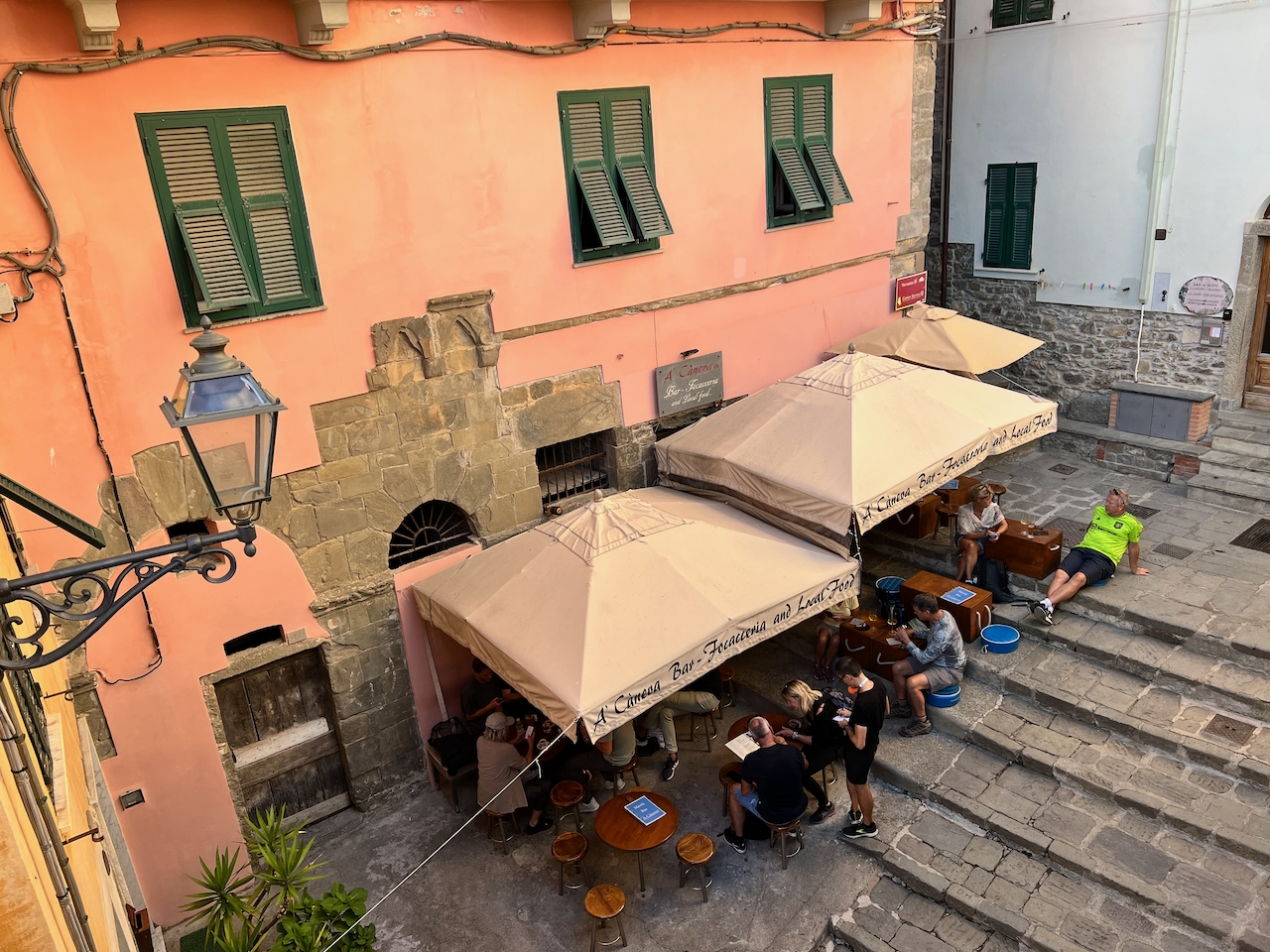 Of the five Cinque Terre towns, Corniglia is the only village without easy ocean access. Because of that, it tends to be a bit quieter. Lots of travel bloggers suggest skipping it if you’re short on time, so this seemed like a natural choice for my four-day seaside stay. I wanted to be in a place where I could gaze at the ocean, and was lucky enough to find a small studio with a balcony and a great view of the ocean, but also broad views of the terraced vineyards, and the rows of buildings that made up the central part of village.