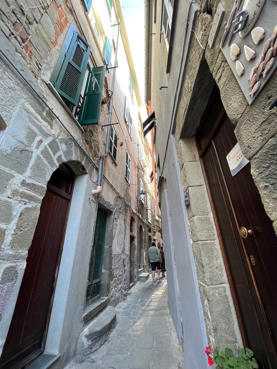 Moving through the shadows of Corniglia’s narrow stone streets, especially in the early morning, when shopkeepers dusted their doorframes and deliverymen lugged their handcarts brimming with boxes of tomatoes or water bottles or toilet paper up steep staircases, I could imagine life in an earlier time, before cars and computers and cell phones. I could imagine how lonely and isolating it might be here in the winter, when the tourists have gone, and the ocean turns rough. Or how exquisitely beautiful. Supposedly, only about 250 villagers remain year round.