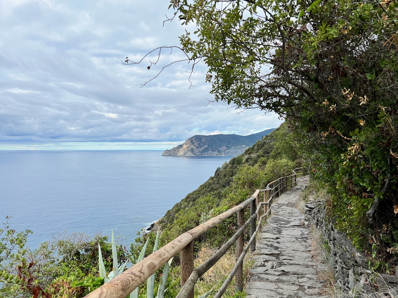 When the church bells in Corniglia chimed at 9 am, I found myself the only person embarking on the trail, past the still-empty checkpoint where rangers will look at your trail pass and make sure you have decent shoes. There were still puddles from the rain the night before, but the dry earth on the trail drank that water up quickly so I didn’t have to pass too many muddy spots. I had heard that there can be a conga line of people along this trail by midday, so it was sweet to have it all to myself. There was a thunderstorm out over the ocean and I wondered briefly if I was doing something dumb, but the forecast had shown everything shifting southward, so I decided to chance it and make a dash to the next village.