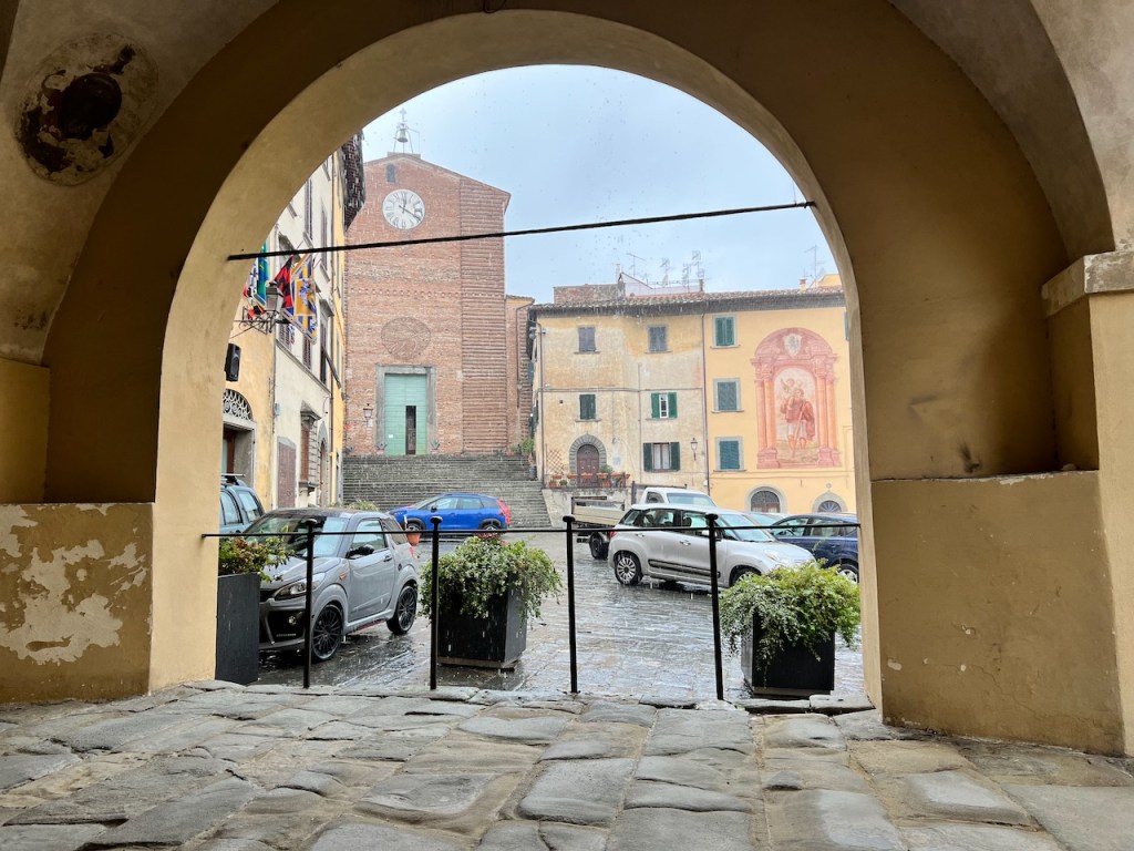 And it did hold off – for about five minutes. Forty-five minutes later, I was still trudging along muddy farmland paths, a bit sweaty under my big poncho. My feet and legs were soaked. After about 3 miles, I came to the city of Fucecchio. The Via Francigena had me cross right through the city center, past the cathedral and lots of shops and restaurants. I hoped to find a covered cafe to sit and wait out the rain, but the only cafe I found was closed. Eventually, I found a post office with a wide covered patio, and moved there to dry out for a bit.