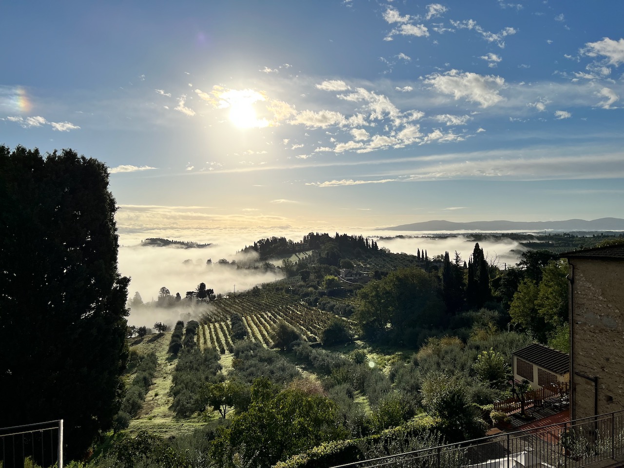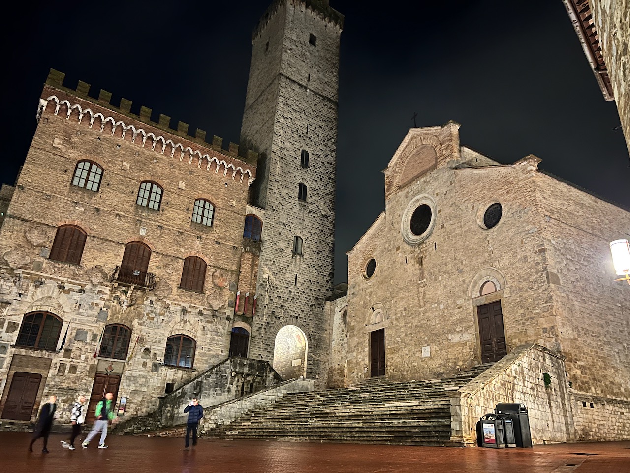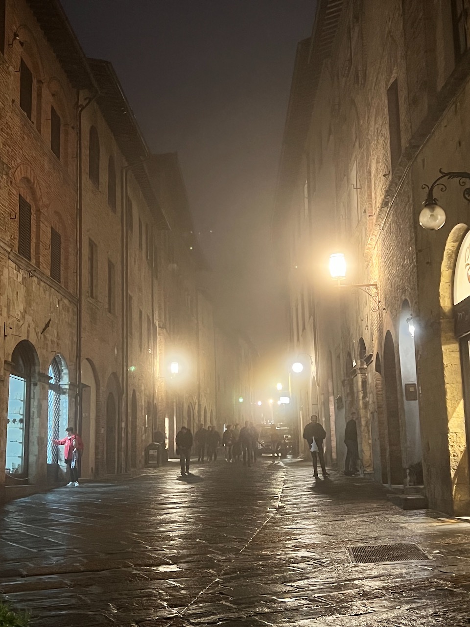 Things went a lot more smoothly after that first rainy day. Although, I still had to contend with considerable rain and mud. But I managed to get my walking in early in the day before the rain got too heavy. My shortest walk on Day 2 took me about 7 miles, and my longest walk – the one that took me into the city of Siena – was about 14 miles. Each day I found myself in a new town, with new views, more history, another gelato shop. The Via Francigena winds through the Chianti region of Tuscany from one medieval hilltop town to the next. I stayed in a mix of hotels and B&Bs, and one very fancy vineyard/resort. Also, on one night I found myself in a 13th century monastery/pilgrim hostel, the Ostello Sigerico. This was the one place where I actually had a chance to meet other Via Francigena pilgrims.