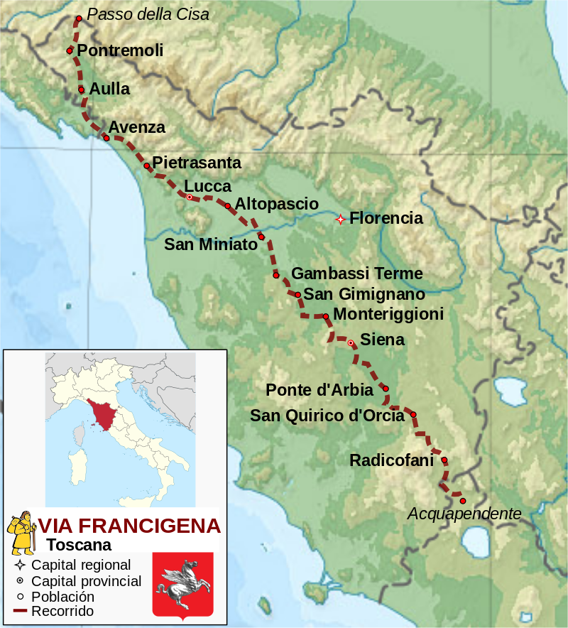 When I imagined walking across a European countryside to clear my head, I initially thought it would be on the Camino de Santiago, the famous pilgrimage route through Spain that attracts (literally) hundreds of thousands of people each year. But the more I considered it, the more I wanted to try something a bit quieter, and less well trodden. That’s when I found the Via Francigena, the road to Rome. If I were to walk the whole thing, I would have to start in Canterbury, England. The full walk extends from Canterbury, through northern France, into Switzerland, across the Alps, and through central Italy to Rome. But I just wanted to taste the Tuscan segment of this walk. I only gave myself a week for this, after all.