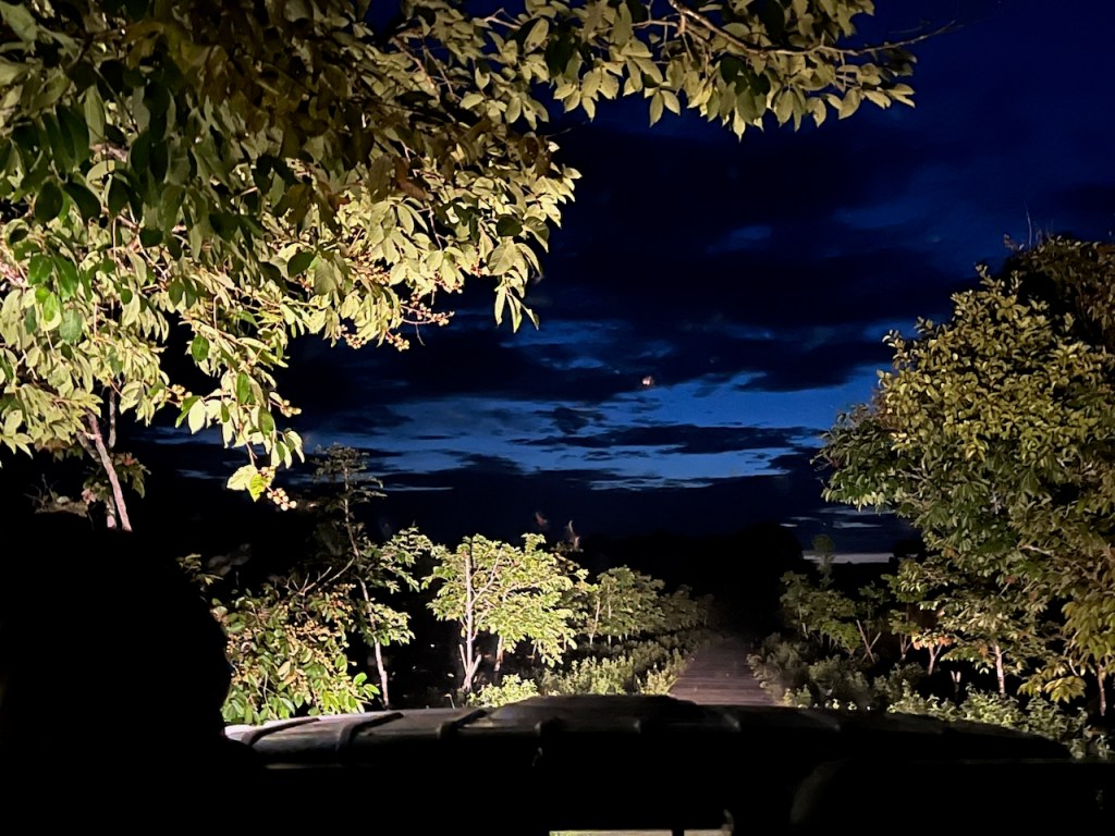 We sat on long benches in the middle of large flatbed trucks with 50 of our closest friends as we trundled along a lightly paved road in the fading dusk. Our night safari tour guide at Cat Tien National Park stood at the front of the flat bed, leaning on the back of the cab of the truck, his searchlight scanning the landscape and the lower branches of trees that sometimes came rather close to our heads. Large termites, drawn to the light, joined our tour.