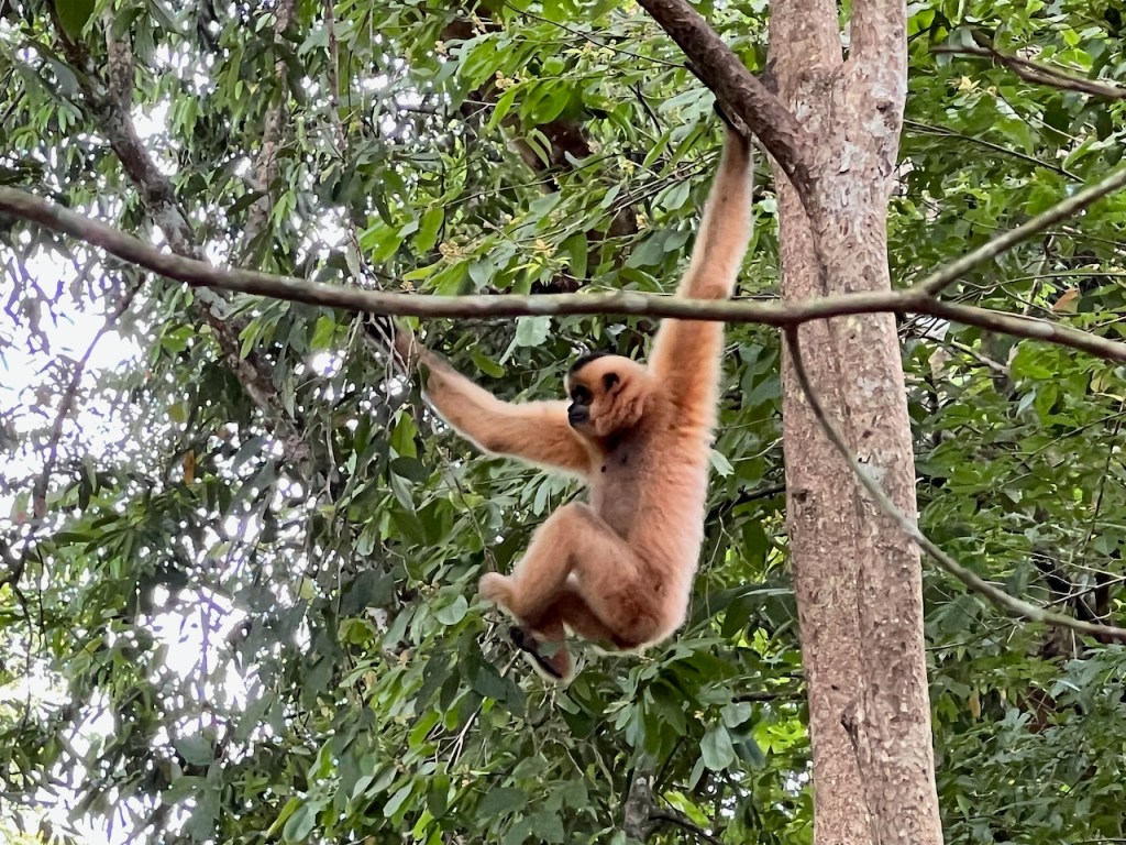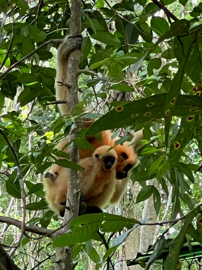 Then we heard the sound we had been waiting for: a high-pitched metallic whine, followed by rapid chirping. It sounded like gunfire in a Star Wars movie. It was far away and our guide said these were the gibbons at the visitor center, where there is a small refuge for gibbons that are unable to be in the wild. But then we heard it again – much louder. Vu started moving through the forest, off the trail. We followed as best we could. Vu moved quickly and smoothly, while we stumbled on roots and hanging liana vines, or snagged our clothes on sharp spines. Occasionally he stopped, holding up his fist to signal for us to do the same, and we would listen to the whining and whistling and staccato cry of the gibbons, while we craned our necks to scan the tree tops. And then we saw one – a glimpse of orange moving through the canopy far above us.